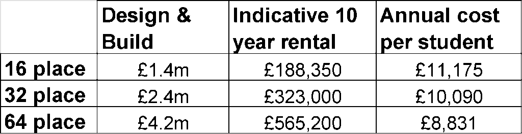 - 16-Place Setting: Approx. Β£90.6k per student place (Capital cost ~Β£1.45m).